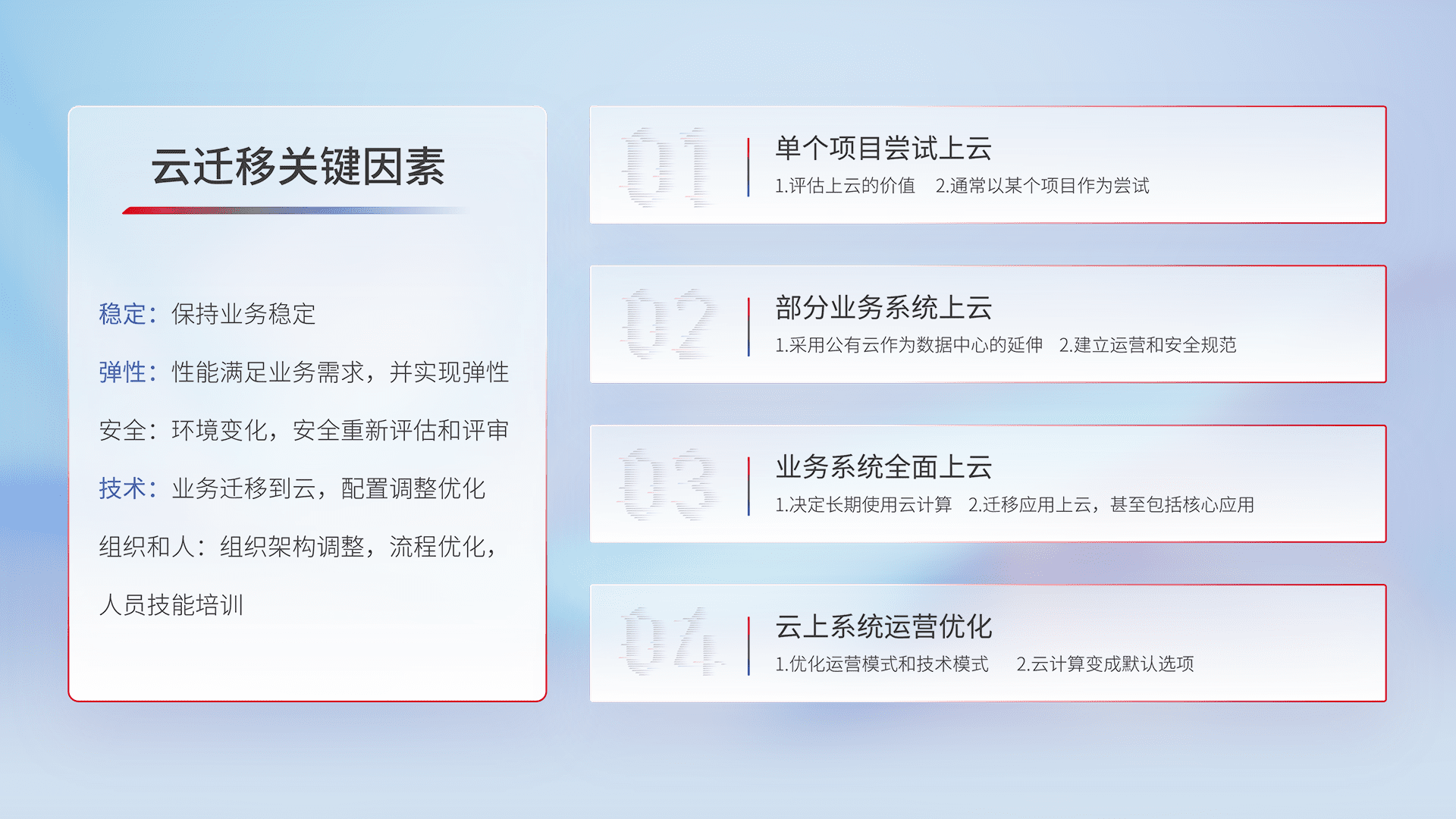 结合实际业务,,,从规划设计、、云平台选型、、、云原生改造、、、数据迁移、、集成交付,,,,迁移全过程为客户识别最佳上云路径,,做好风险识别管理,,,设计网络架构、、身份权限、、安全审计合规、、、操作审计、、、日志审计、、监控告警策略、、、、多站点容灾设计等,,,对云上基础设施进行整体规划,,,,提升IT治理水平,,以满足弹性、、高可用、、、、高性能的需求。。。
